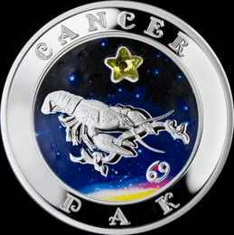 Rewers: Na pierwszym planie wizerunek Raka, w tle niebo z gwiazdami imitujące zorzę wieczorną. Po lewej stronie Raka zielona cyrkonia, w kształcie gwizdy symbolizująca awenturyn – szczęśliwy kamień dla urodzonych pod znakiem Raka, po prawej graficzny symbol Znaku. Na obrzeżu monety napis „Rak”, w języku angielskim i rosyjskim.