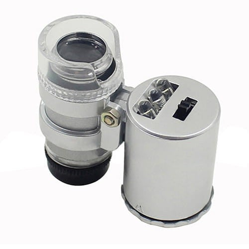 Mini mikroskop kieszonkowy - powiększenie 60 x, z regulacją ostrości, z podświetleniem: 2 x LED i 1 x UV LED. Etui w komplecie.